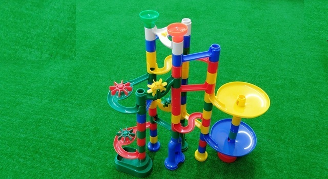パーツを組み立ててコースをつくり、ボールを転がすおもちゃです。